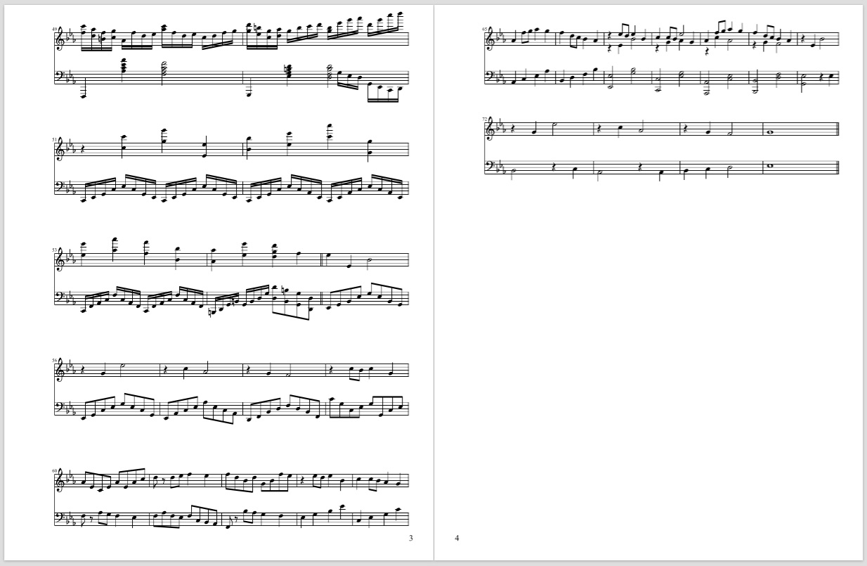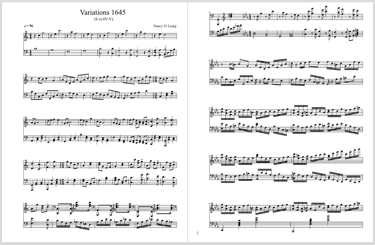 Composition exercise. Variations on the chord progression: I-vi-IV-V. This chord progression contracts and expands and interweaves two themes (introduced measures 1-4, and 5-8).