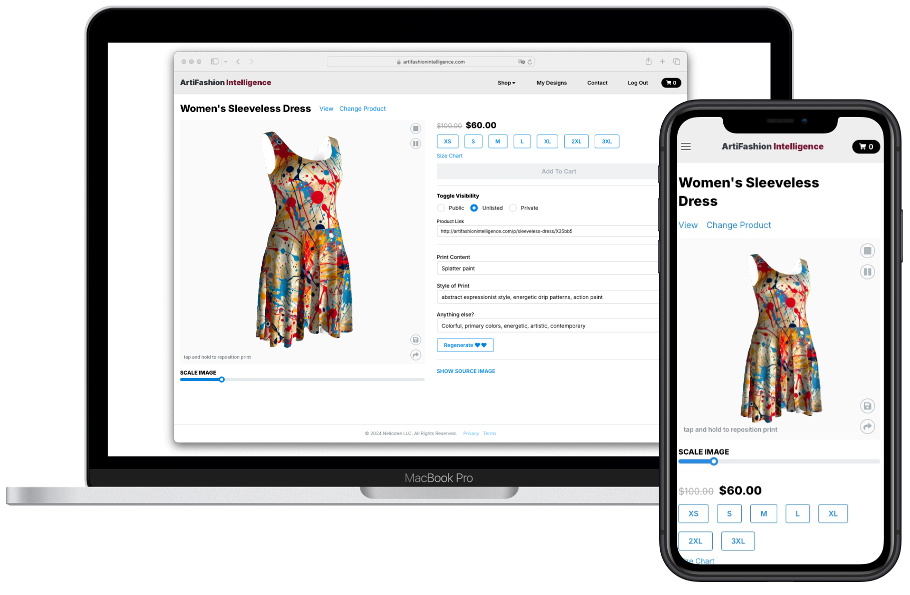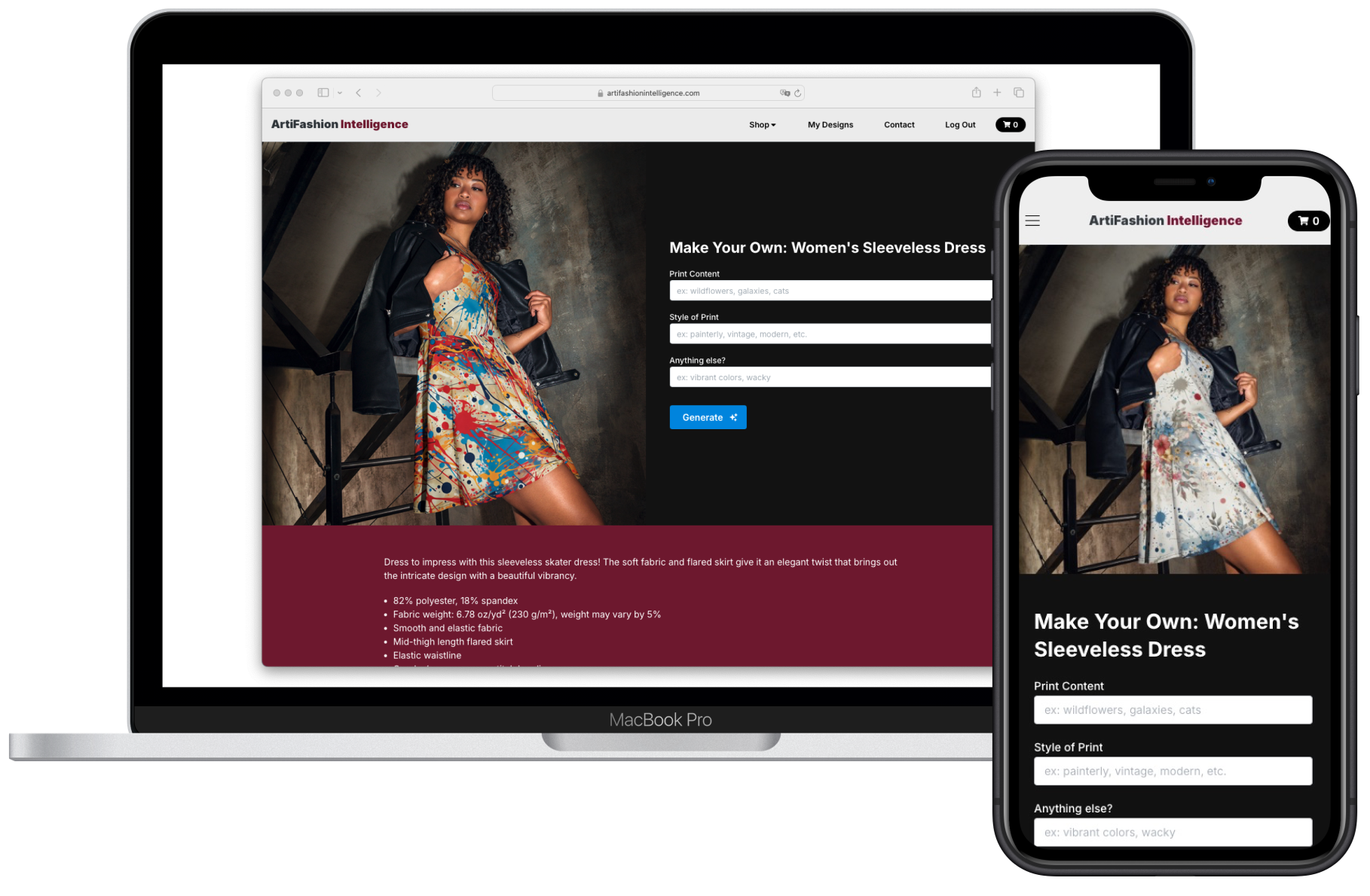 Use AI to generate prints and graphics for apparel products. Customers create their own graphic designs on dresses, shirts, leggings, and swimwear.
