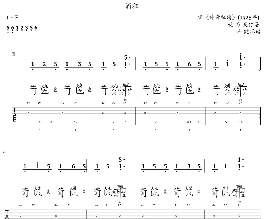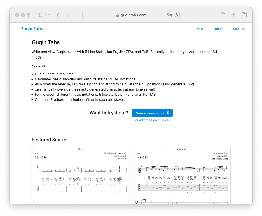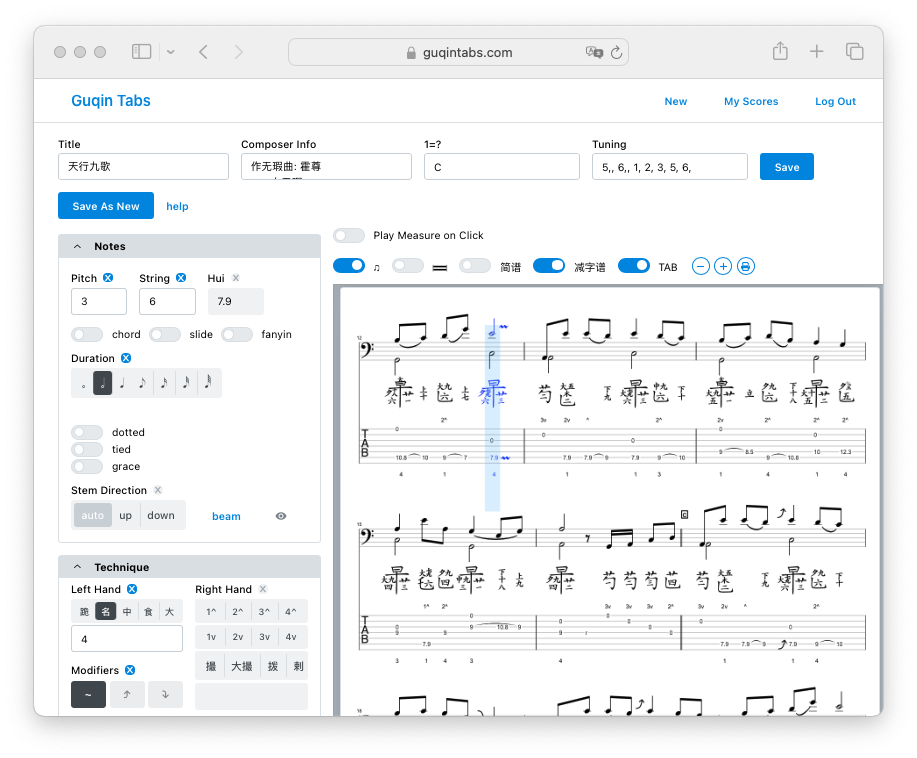Write and view Guqin music with 5 Line Staff, Jian Pu, JianZiPu, and TAB notation. Features include: