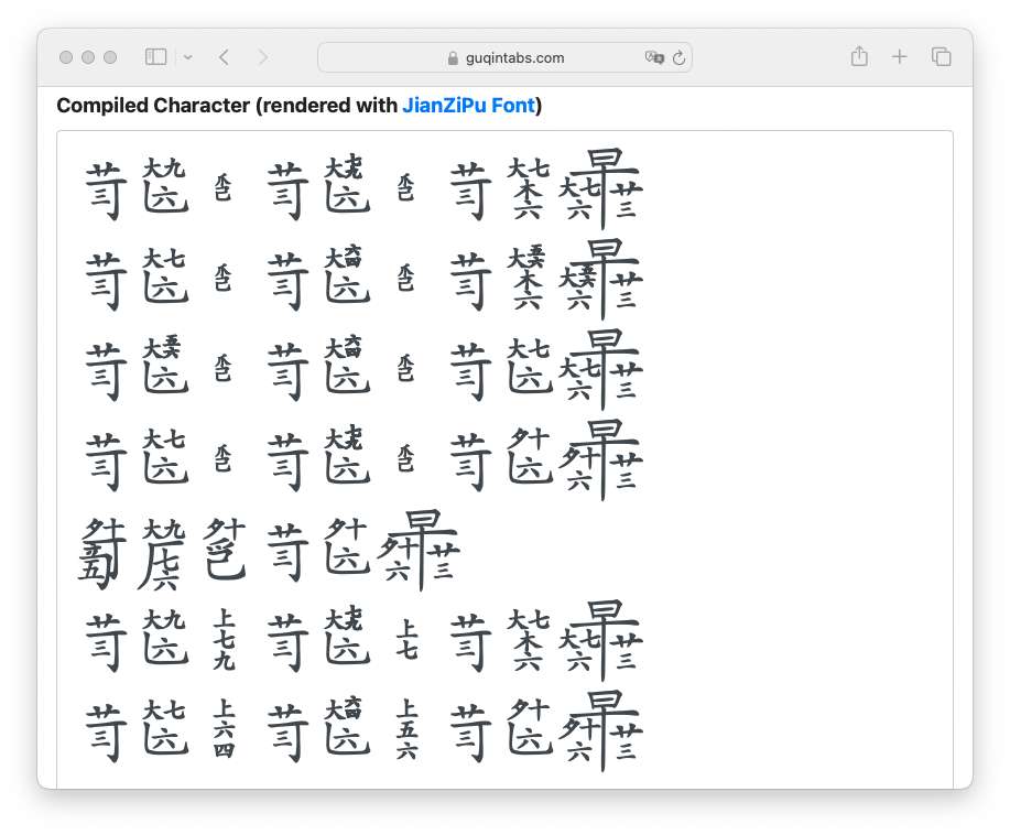 JianZiPu is a way to write notation for Guqin (古琴) music. Guqin music is traditionally written using a character based system, but the character set isn't really found in any known languages. It looks like Chinese characters, and has components of Chinese characters, but it's unlikely you'll find most of these characters in the Chinese unicode system.