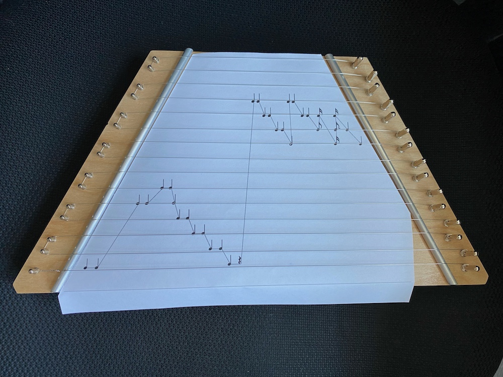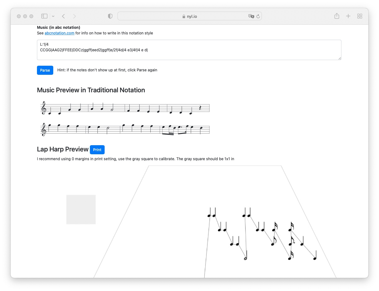 With this tool, you can write out a small tune using ABC notation, see a preview of the music in staff format, and print out the trapezoidal lap harp. You can customize the print out based on the size of your lapharp since different manufacturer might have different dimensions.