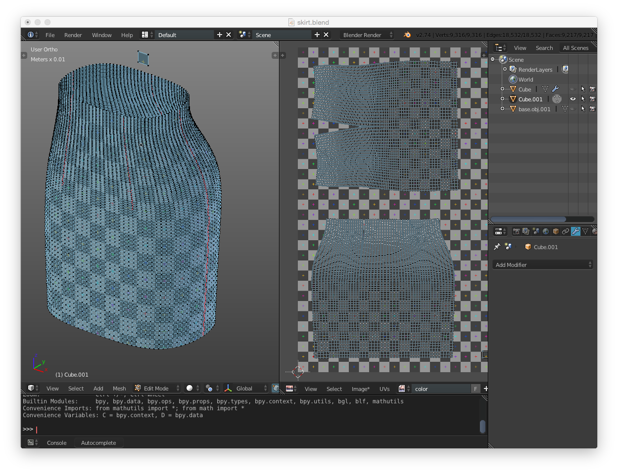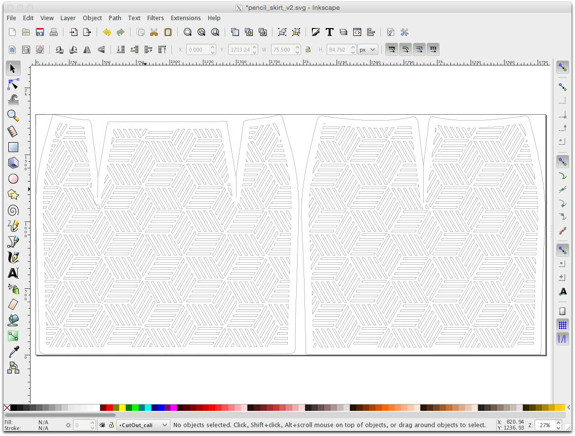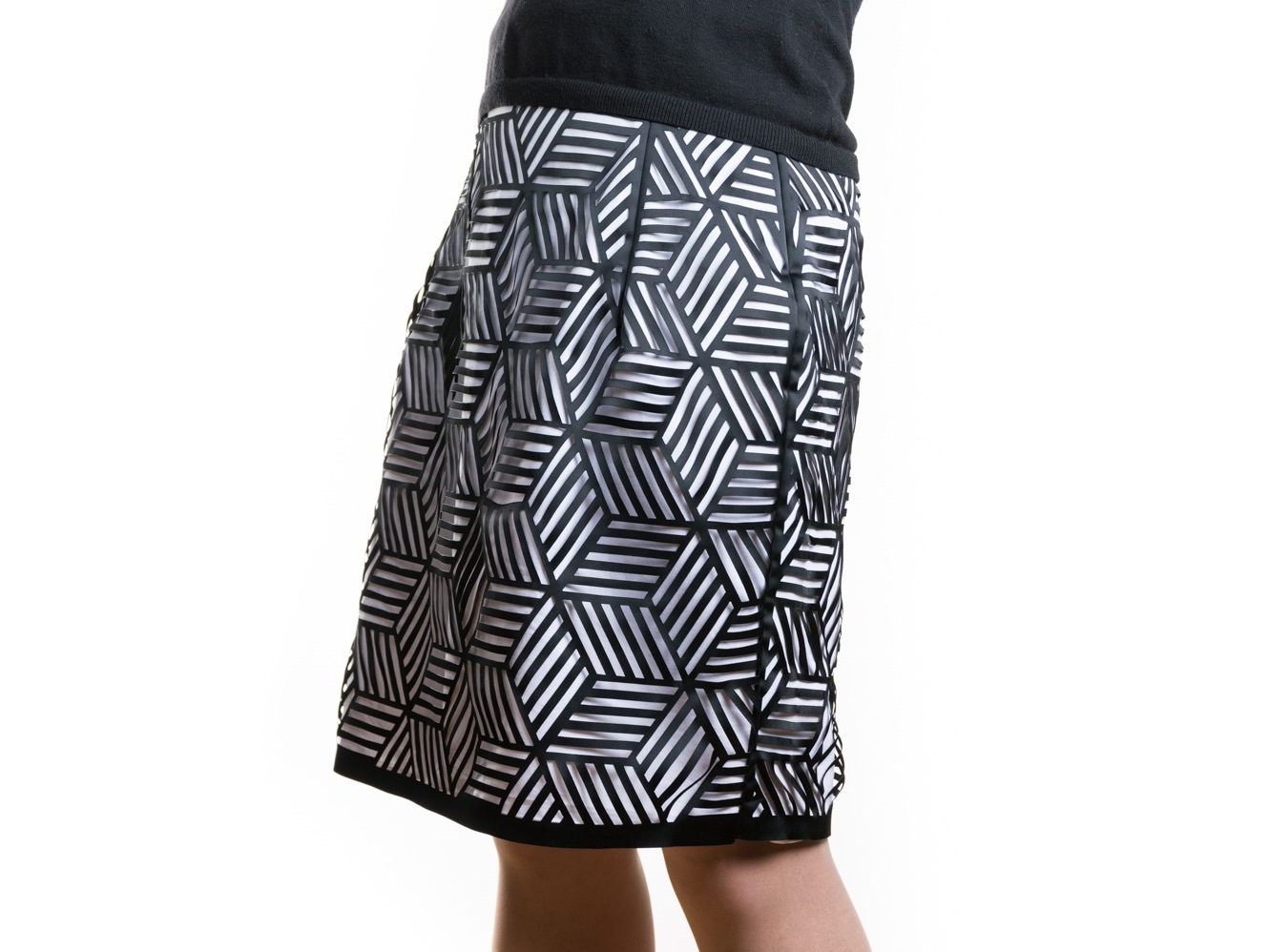 Experimenting with technology to make apparel. I used Blender to model a skirt in 3D. Using animation tools (unwrapping the "skin" of the skirt), I was able to extract a 2D pattern for sewing. I cleaned up the pattern in InkScape (vector drawing tool) and added some geometric graphic design to make it more interesting. I used a laser cutter to cut the fabric, and sewed by hand.