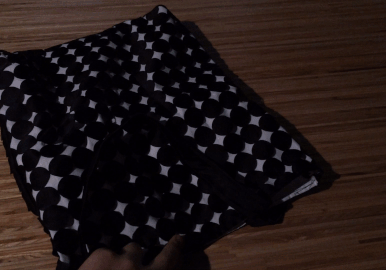 This prints on this bag are made with laser cut fabric. The light turns on when the magnetic clasp is opened, disconnecting a circuit that feeds into a transistor NOT gate.