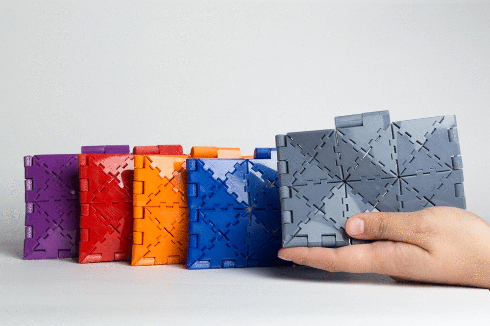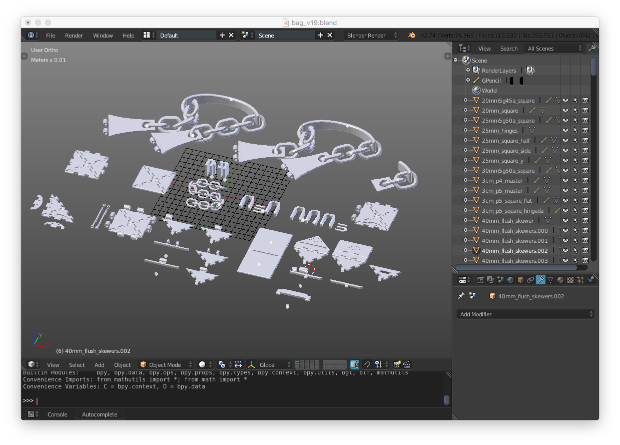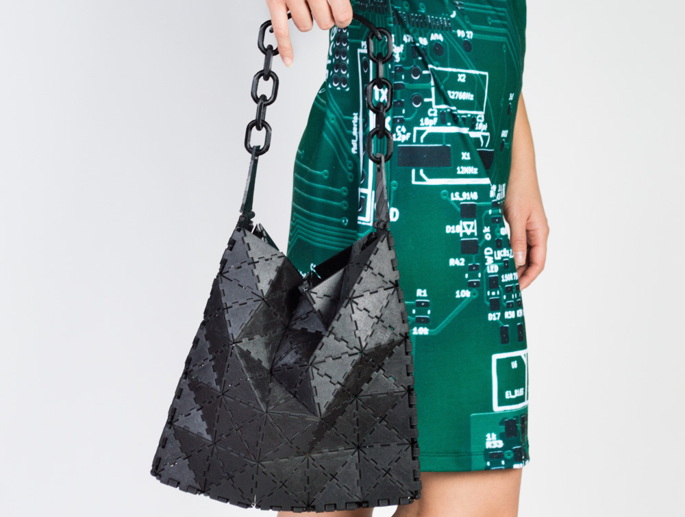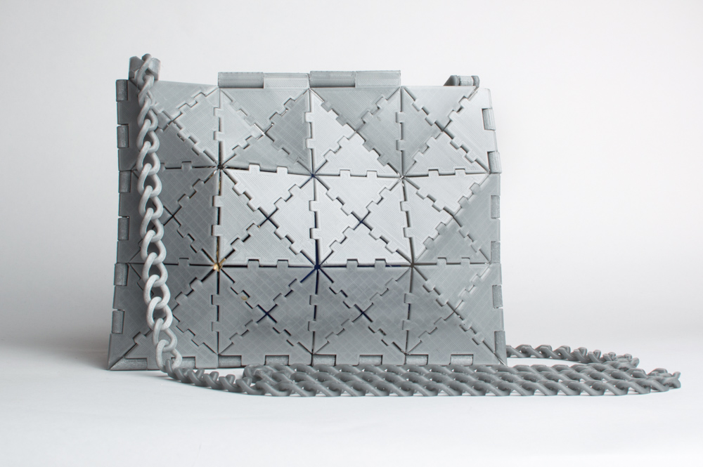 Modular system for creating 3D printed bags and wallets of various sizes. The glossiness is made because the bag is printed on a heated glass build plate, which creates a shiny surface. Small hinges are 3D printed in place. Larger hinges are assembled with 3D printed parts. The only non-3D printed parts in this product are the magnetic clasps.