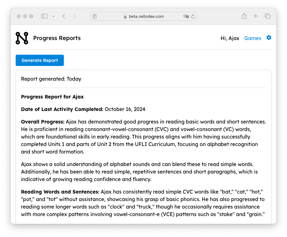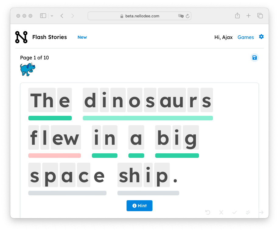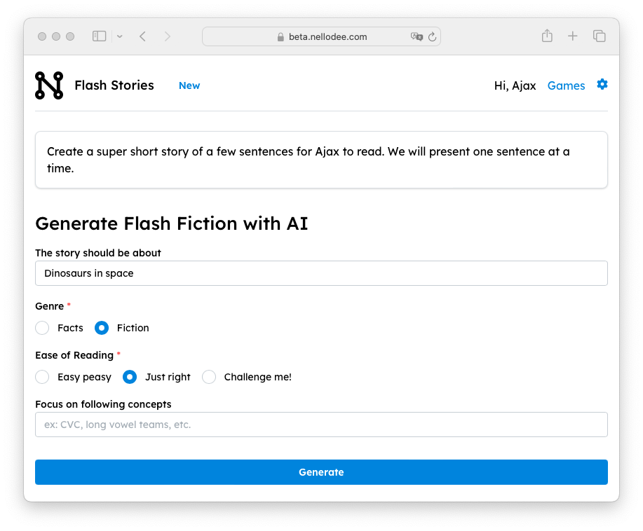 Nellodee helps you generate words and stories to practice reading for your early readers. We use the magic of artificial intellignece to tailor our content to your student's reading level and interests.