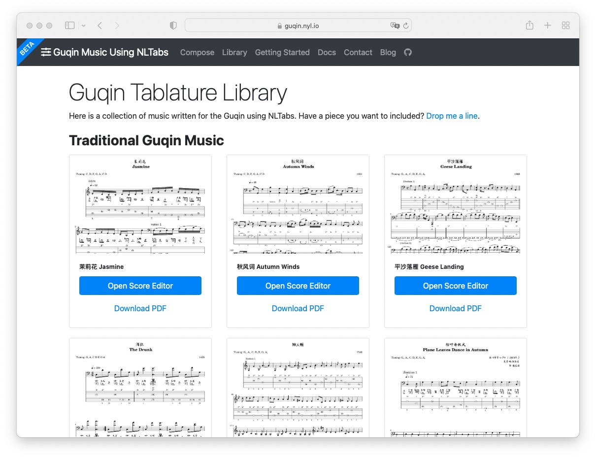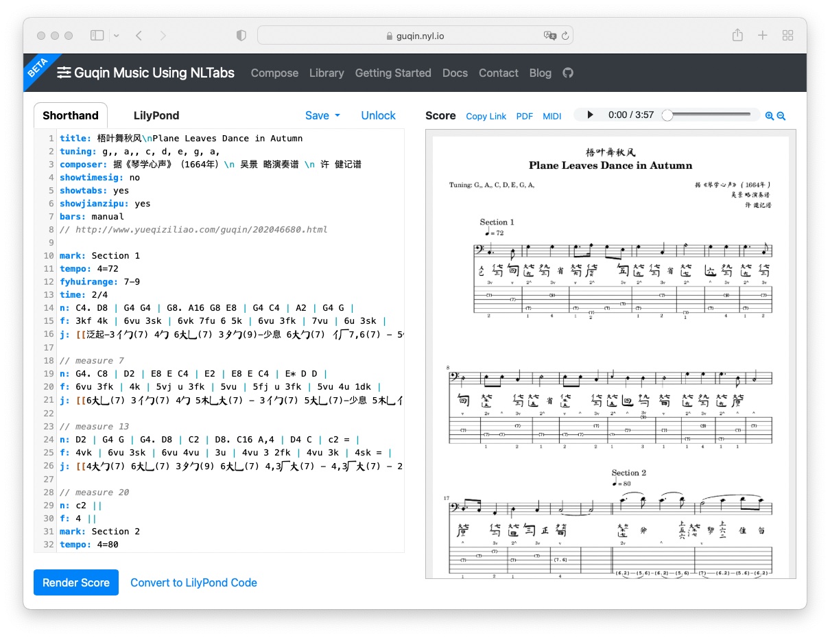Create Guqin music with the NLTabs (Numeric Linear Tablature) system. This creates Guqin music with a simple, text-based entry method. Guqin Notation traditionally has been a bit tricky to read. It's efficient in that it compresses a bunch of playing instructions into characters. However, it has a rather steep learning curve, and more importantly I could not find a way to write scores in the traditional notation on a computer. I don't really own paper anymore, so..... I created my own system for writing Guqin music!