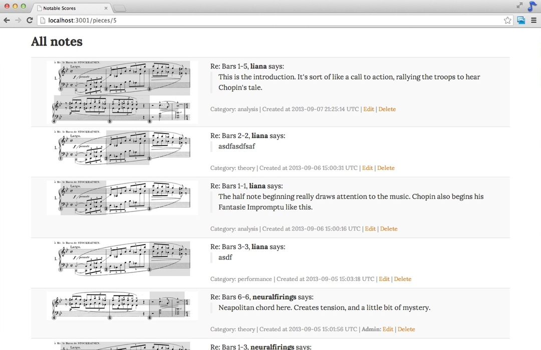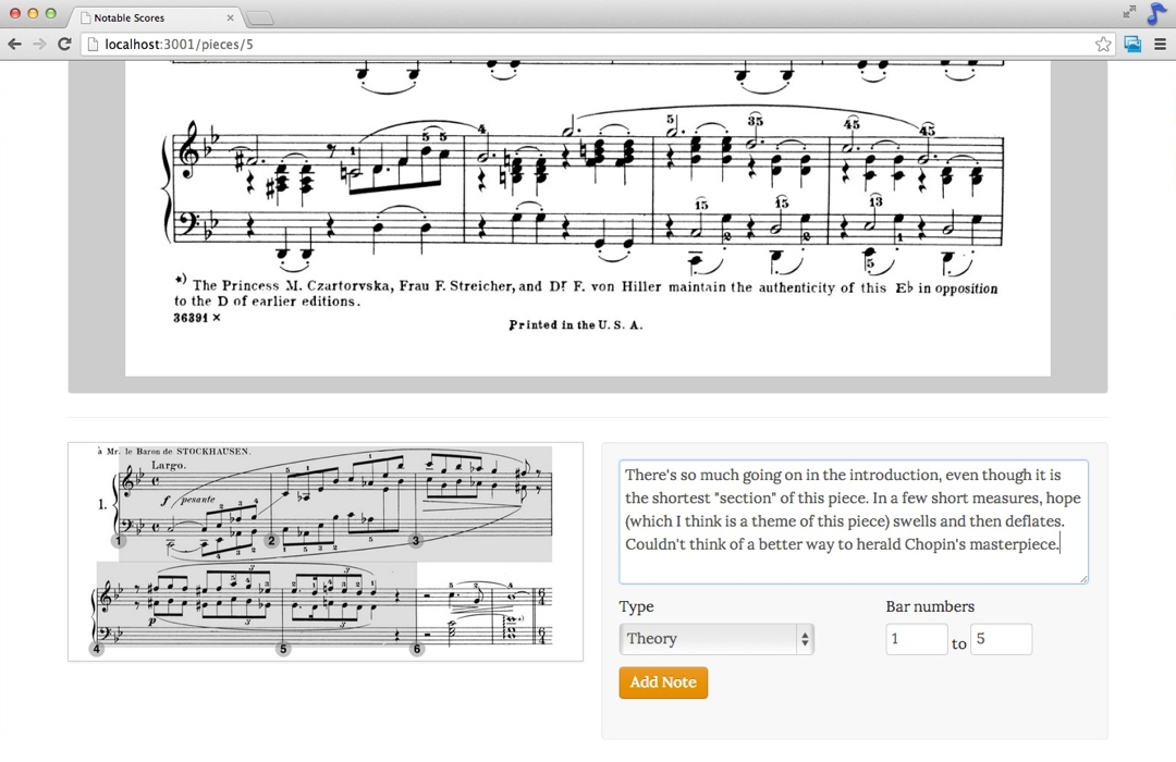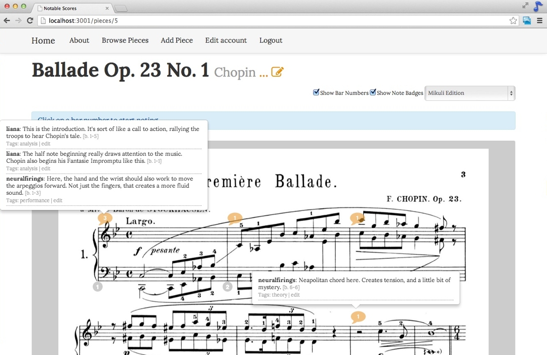 Notable Scores is a way for musicians to collaborate remotely. Musicians can make notes on sheet music, annotate sections of music, and respond/converse with others. They can jump navigate sheet music by measure numbers and generate images of sheet music clips to share online.