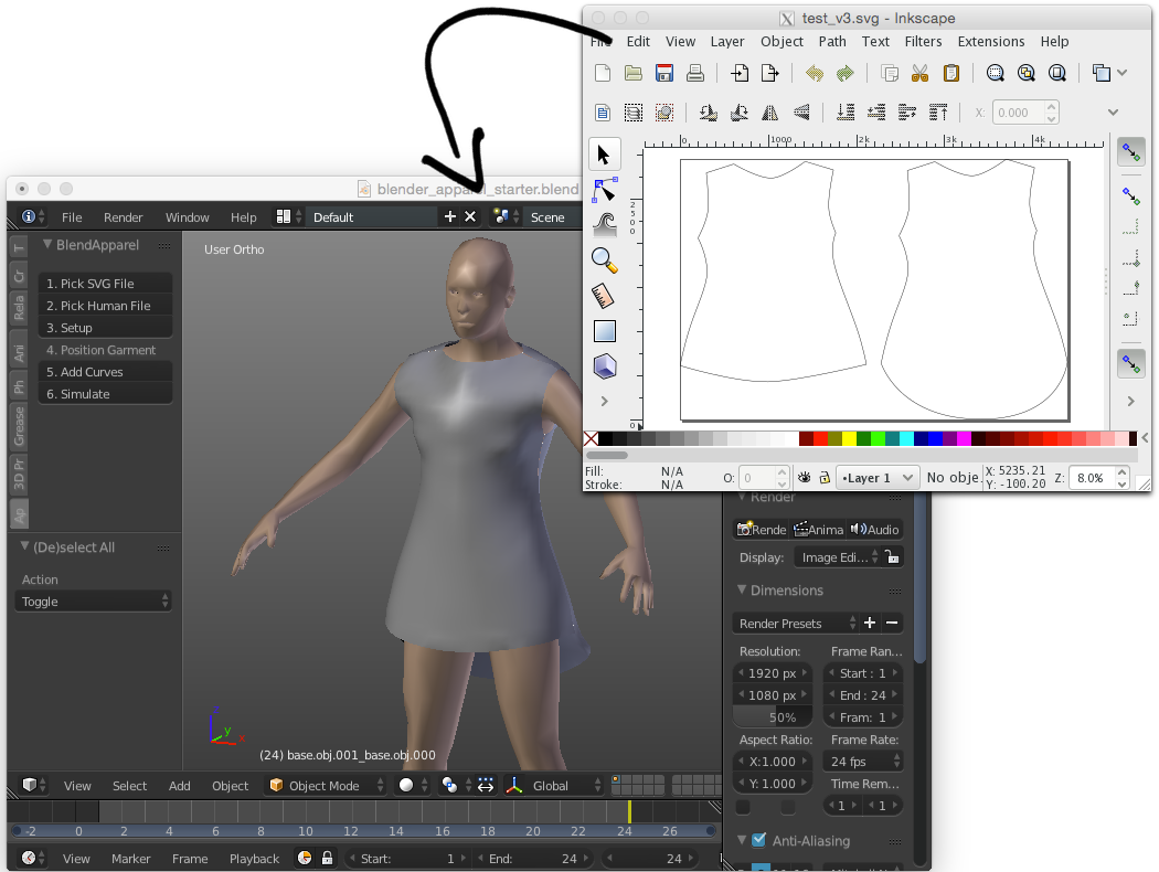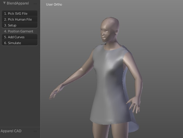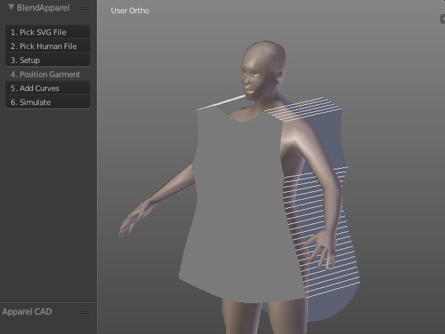 User can import their 2D clothing patterns, select seam pairings, and see a simulation of the sewn garment. Uses Blender, Python, cloth simulation. Plugin will generate images and videos.