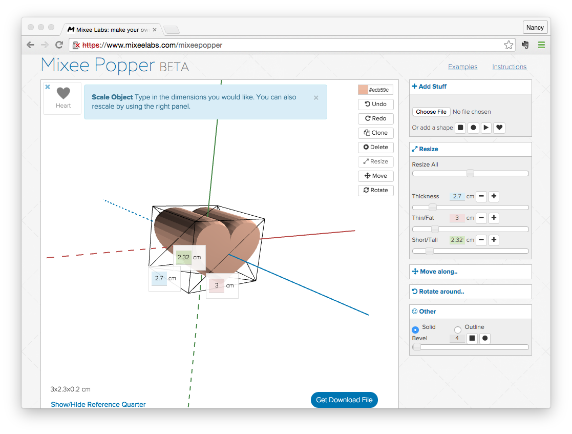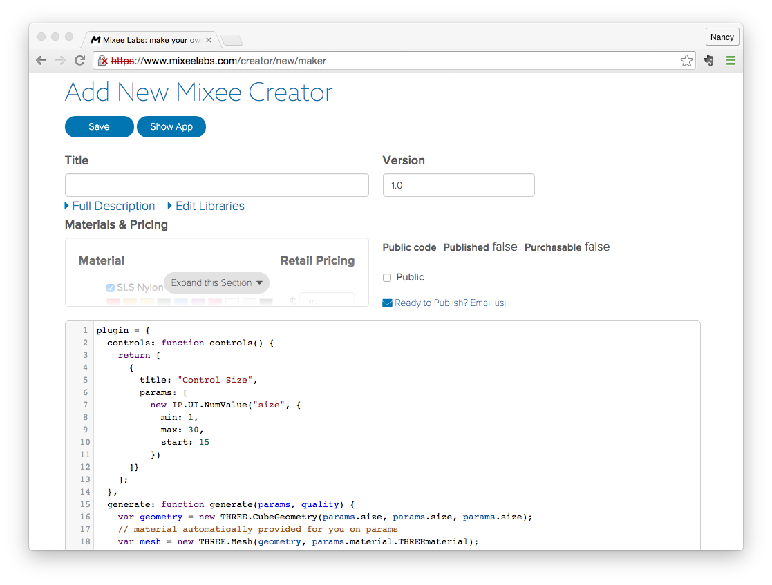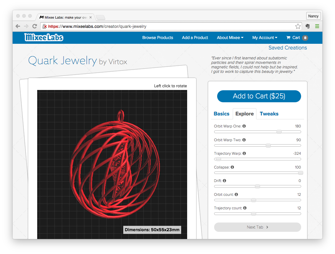 Mixee Labs is a platform for designers to create customizable products and sell them online. We manufacture these customized goods on-demand using 3D printing. With our JavaScript Platform, developers can program 3D objects using JavaScript. They can set parameters that others can use to tweak the object.