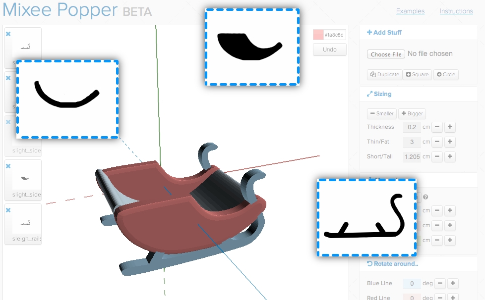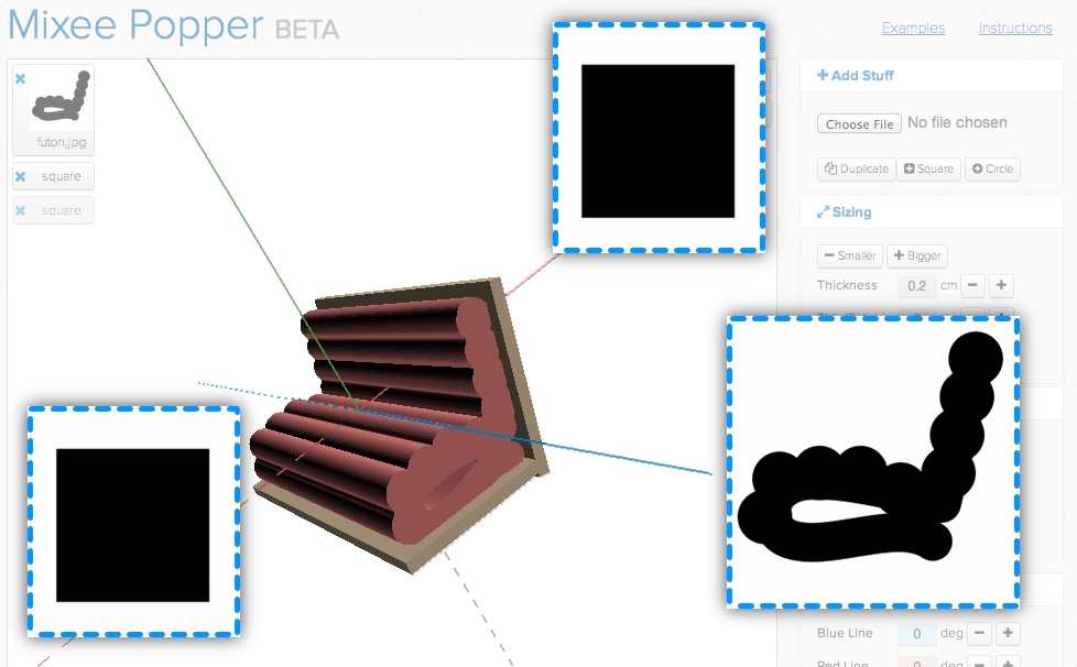 This tool enables people to take 2D graphics and extrude them to form 3D models. Manipulating meshes and vertices can be challenging and 3D model libraries are limited, but most people have access to 2D graphics searches and libraries (e.g., Google image search, Noun Project). This tool was made after noticing (during laser sintering) how the cross sections of 3D models are often made up of extruded 2D shapes (e.g., circles, rectangles).