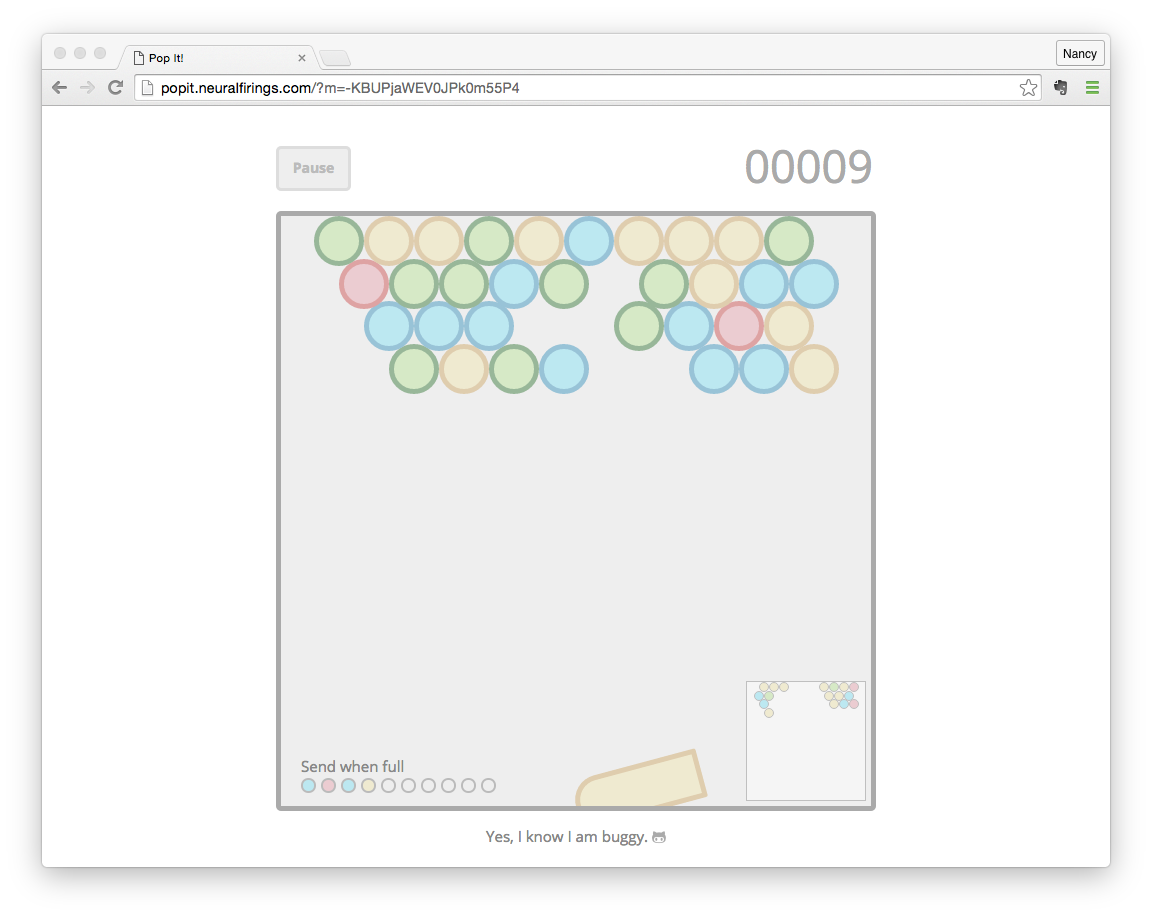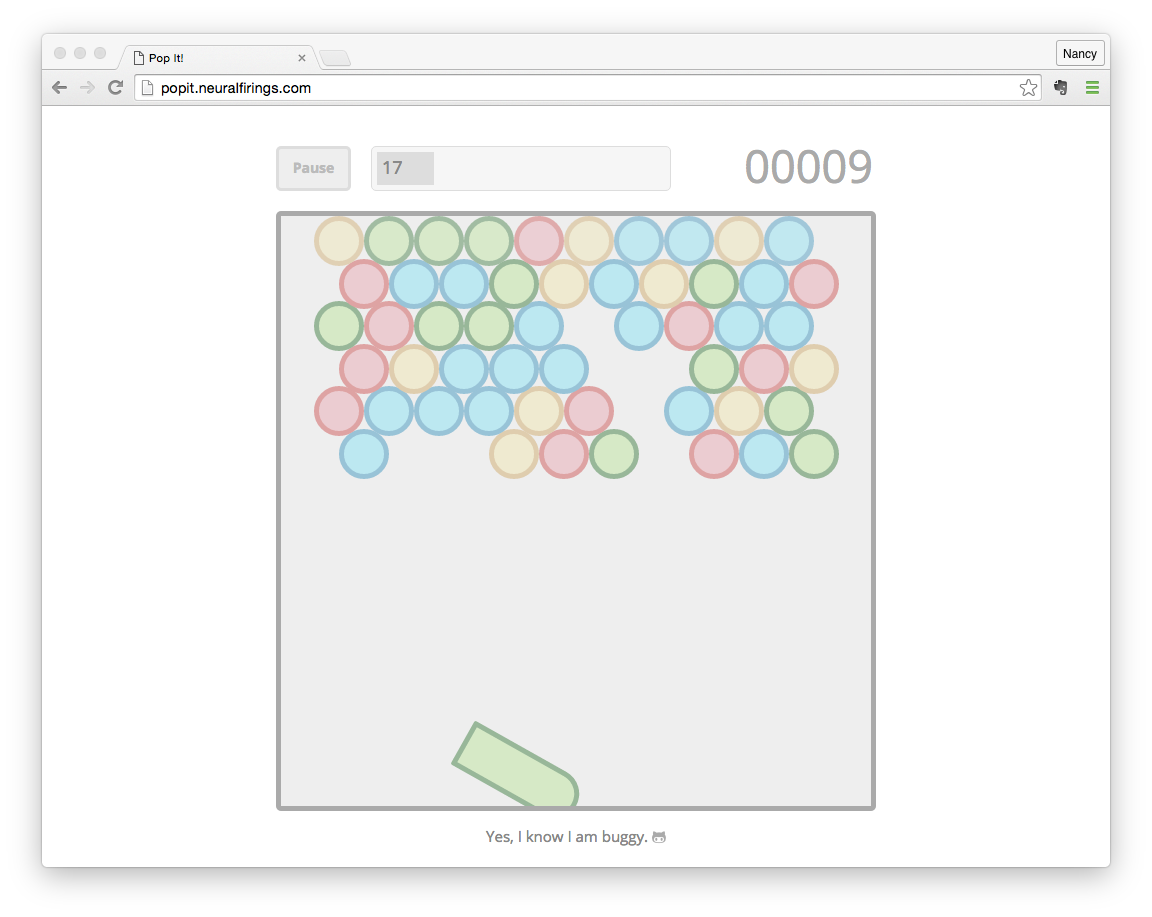 Snood-like shooter game made entirely through Javascript and graphics through CSS (divs, divs, divs!). Also includes a two-player mode where players can send bubbles to one another in a battle scenario.
